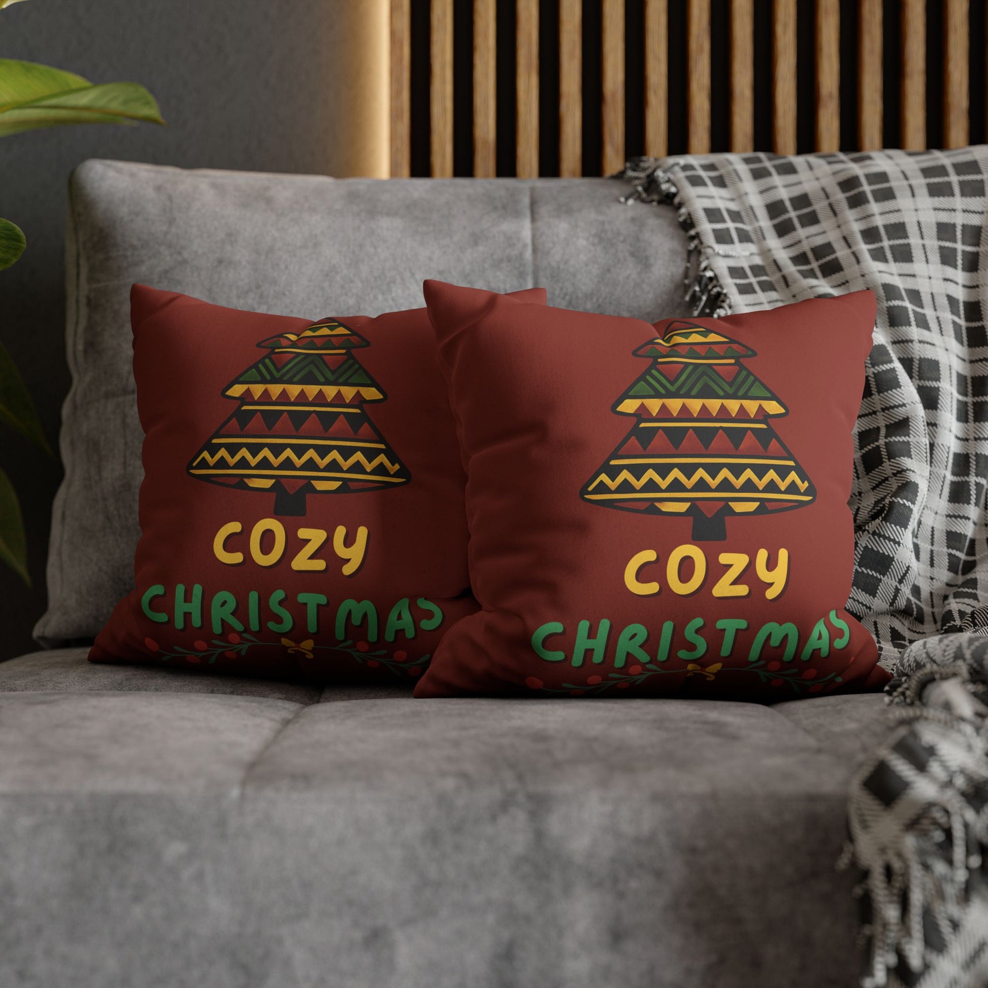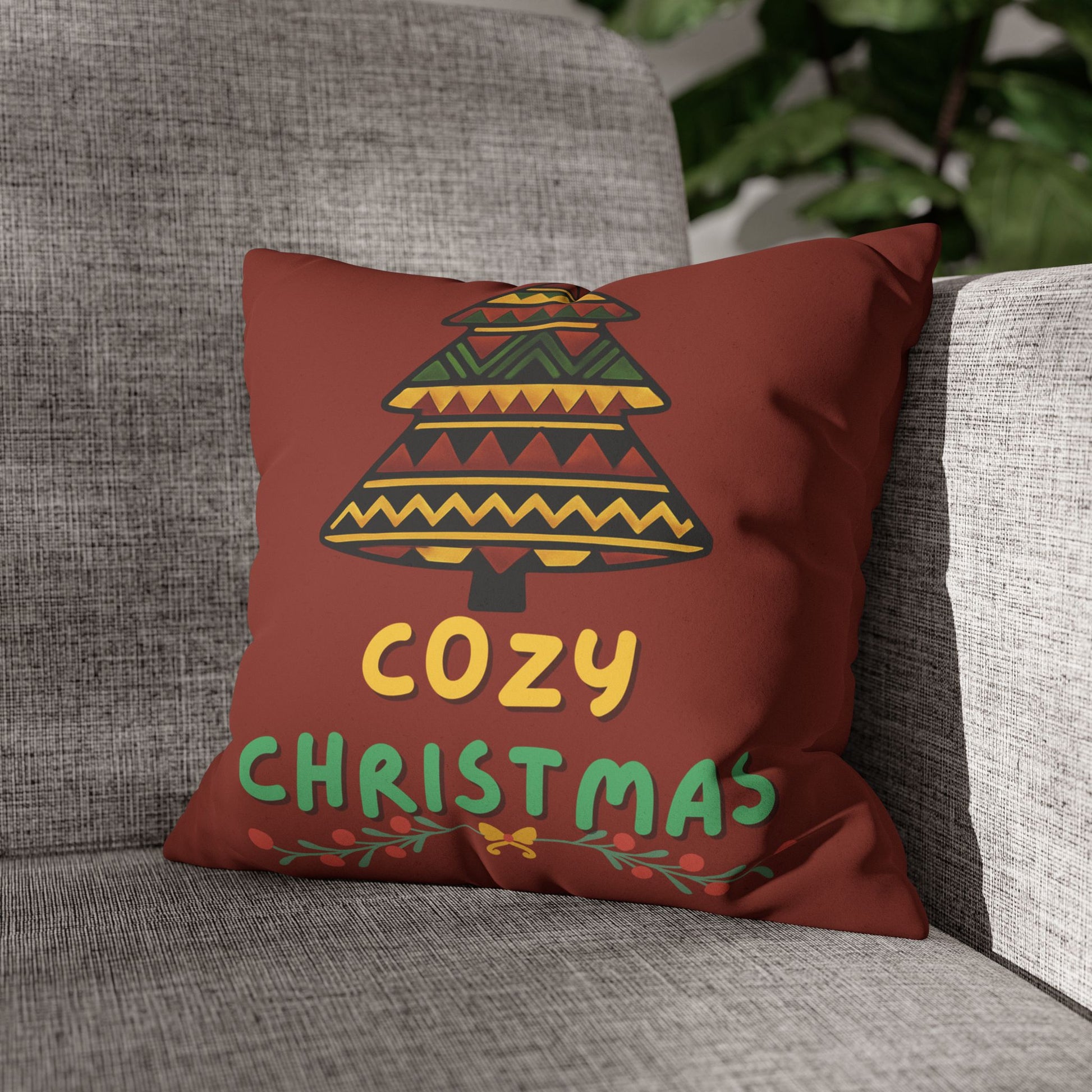 Wrap your living room in gentle warmth with this faux suede square pillowcase. The double-sided print features a hand-drawn, pattern-filled tree and cheerful “Cozy Christmas” lettering on a rich, cinnamon-red background — a quiet nod to slow evenings by the fire, wool blankets, and low-lit evenings spent with close friends and family. The soft faux suede surface invites touch while the concealed zipper and neat edges keep the look refined. Slip it over a slightly larger insert for a plump, structured feel that layers beautifully with textured throws and neutral sofas. It’s a subtle, homey accent that sets a relaxed holiday mood without shouting for attention.