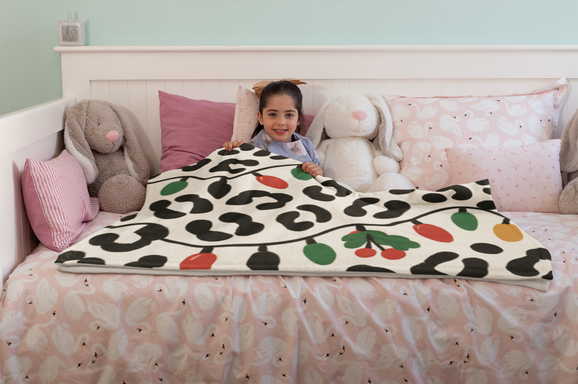 Wrap yourself in warm, playful sparkle with this crushed velvet blanket. The plush, shiny surface catches the light while a bold black African leopard print dances across a creamy background, threaded with nostalgic red, green and amber holiday lights and a sprig of mistletoe here and there. It feels velvety against skin and drapes easily over laps, couches, or laps of a favorite reading chair — the kind of blanket that turns chilly evenings into cozy little celebrations. Bring a touch of festive whimsy to movie nights, stocking-stuffer moments, or slow afternoons by the tree. The single-sided print keeps the design vivid while the hemmed edges hold everything together wash after wash.